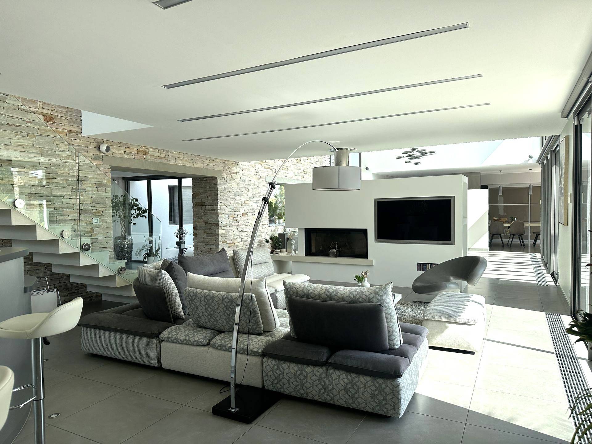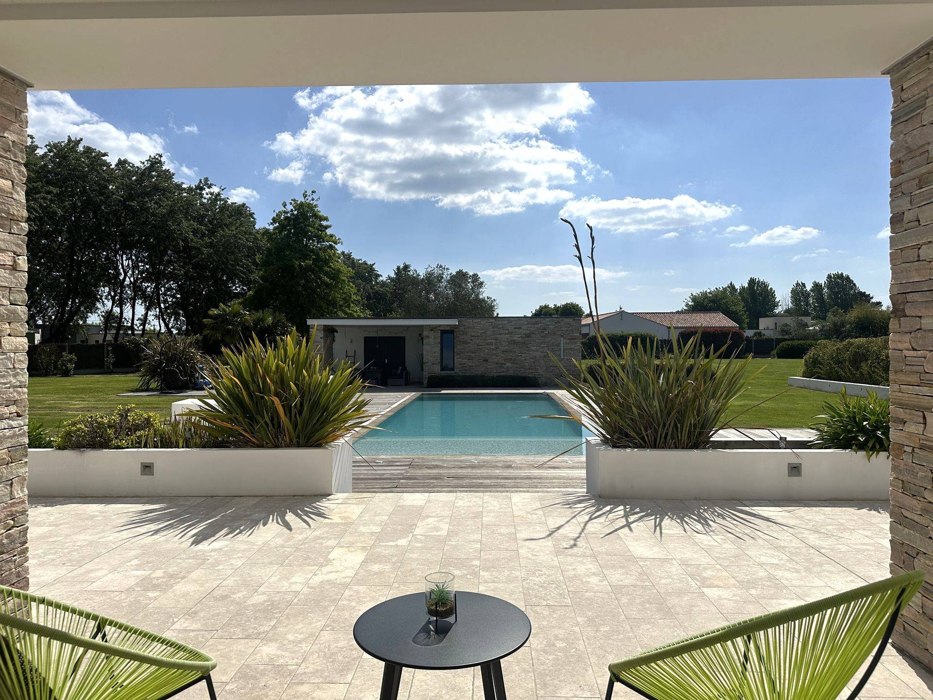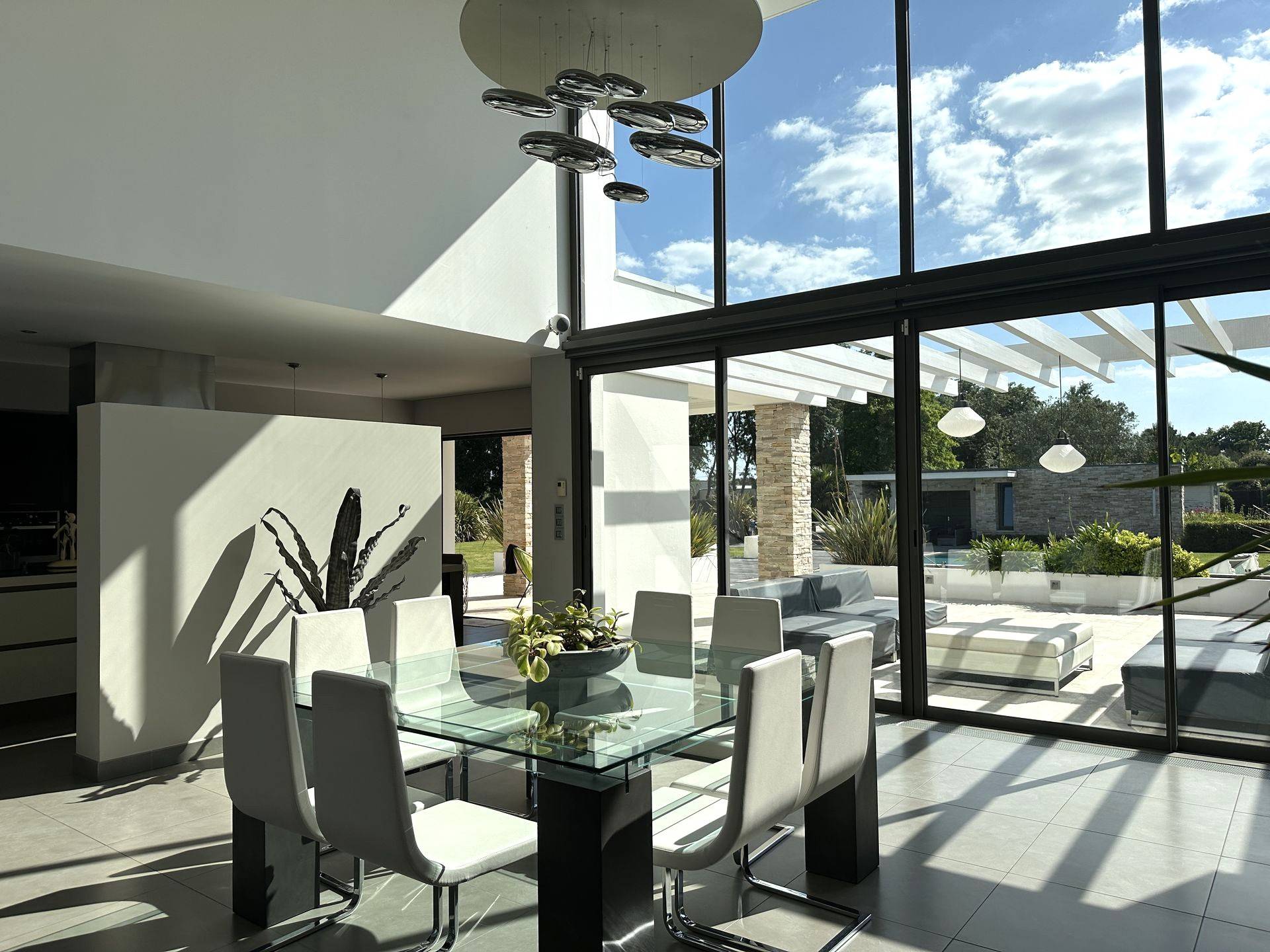Dans un quartier résidentiel de St Hilaire de Riez, cette maison compte un peu plus de 380 m² habitables. Le mélange subtil du bois, du verre, de la pierre et du béton, donne beaucoup de chaleur à cette architecture contemporaine où propriétaires et architecte se sont faits plaisir dans les moindres détails, confort et bien être étant leur préoccupation. La pièce de vie de 124 m² est baignée de soleil et ses différents espaces (salon, bar, séjour et cuisine) la rendent conviviale. A la suite parentale de 40 m², s'ajoutent 3 chambres de plain-pied et 2 autres à l'étage. Une pièce est dédiée aux jeux, une autre au cinéma et le poolhouse est équipée d'un hammam et d'un spa. La piscine à débordement est chauffée et son bassin en mosaïque d'Italie est chic, les terrasses qui l'entourent sont en pierre pour 111 m² et en bois pour 106 m². Rien n'a été laissé au hasard, la diffusion musicale, les jeux de lumière, les dépendances, etc. tout a été parfaitement étudié. Le terrain clos de plus de 6000 m² est remarquablement aménagé. Pour preuve, les propriétaires le confient de temps en temps à des boîtes de com pour réaliser des shooting photos pour des catalogues de mobilier de jardin, mais il n'y a pas d'obligation à continuer bien sûr ! Cette propriété aux prestations luxueuses est une des plus vastes à seulement quelques kilomètres des plages et de Saint Gilles Croix de vie. Les informations sur les risques auxquels ce bien est exposé sont disponibles sur le site Géorisques : www.georisques.gouv.fr