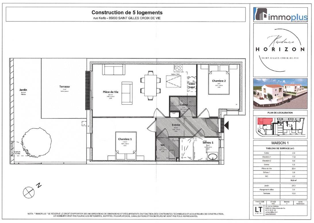 Petit programme de 5 maisons à construire avec stationnement, réalisé par un promoteur local. Maison de 56, 80 m² habitables comprenant 2 chambres, un rangement vélos, un stationnement. Parcelle de 107 m² (dont 21,30 m² de jardin + 12 m² de terrasse) Côté pratique : Frais réduits (soit prix acte en mains de 306 000 EUR) Les informations sur les risques auxquels ce bien est exposé sont disponibles sur le site Géorisques : www.georisques.gouv.fr