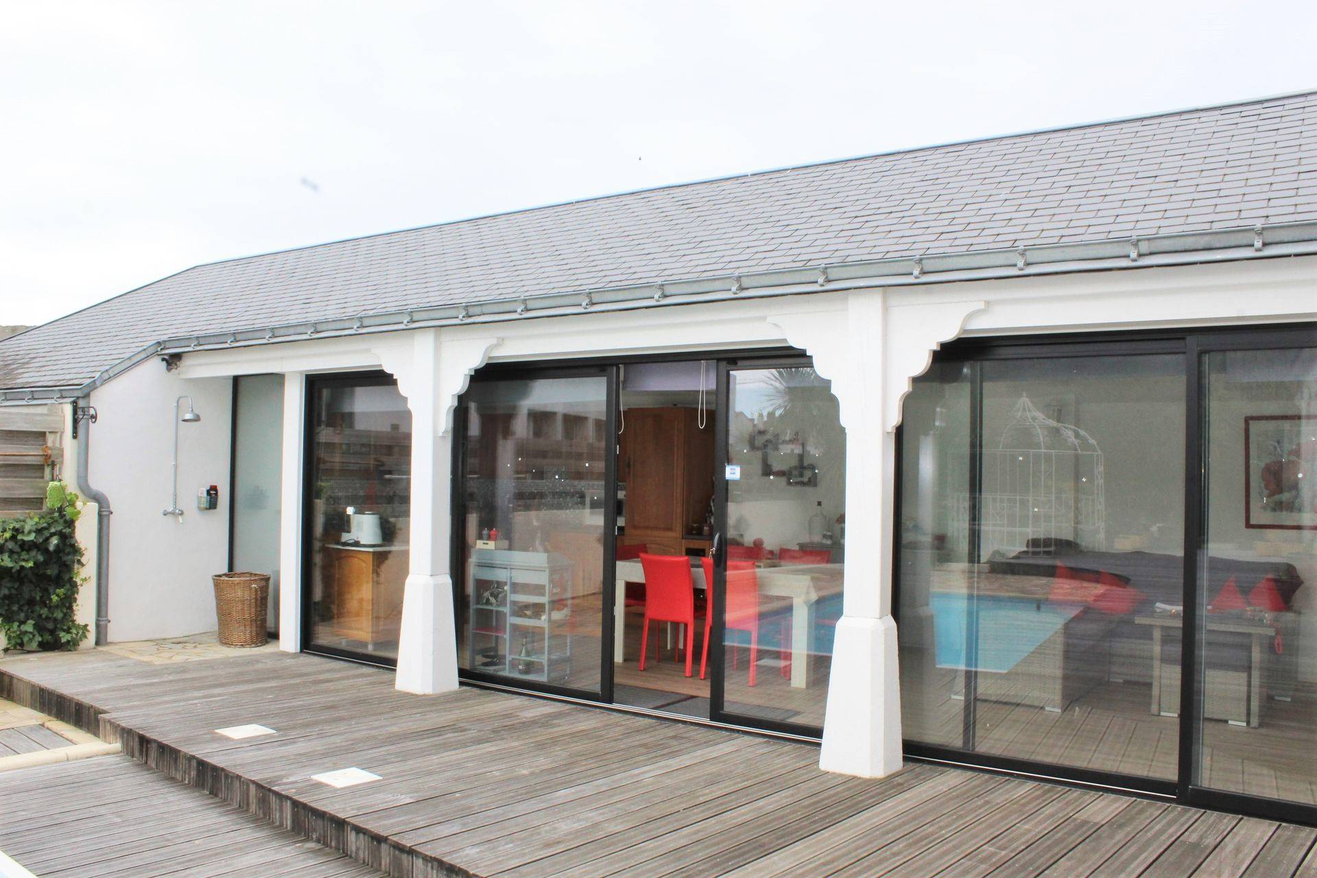Au coeur du Vieux Saint Gilles, la propriété se devine derrière la cour d'une ancienne école. D'une surface totale de 231 m² habitables, elle se décompose en deux parties: la première, entièrement de plain pied de 165 m², s'ouvre plein Sud sur l'espace piscine et son pool house de 38 m² entièrement équipé. La seconde partie a été aménagée, en partie, dans une chapelle de 1880. Elle comprend au rez-de-chaussée, un vaste bureau et à l'étage, deux chambres, une salle de bains et un wc. Cette partie peut être indépendante, l'accès étant possible directement par la rue, en empruntant un escalier extérieur. Aux pieds de la chapelle, un parking privatif donne la possibilité de dédier cet espace à une profession libérale, du télétravail, etc. L'atelier de 21 m², le double garage et le grenier très logeable sont des annexes très utiles et rares dans ce quartier si proche des marchés et des quais. Le stationnement de plusieurs véhicules est aussi possible dans la cour d'accueil. Côté pratique: chauffage PAC, DPE C, aspiration centralisée, cheminée, 2 salles de bains, 2 salles d'eau, 5 wc, maison sécurisée par des portails electriques, des grilles et une alarme. Les informations sur les risques auxquels ce bien est exposé sont disponibles sur le site Géorisques : www.georisques.gouv.fr