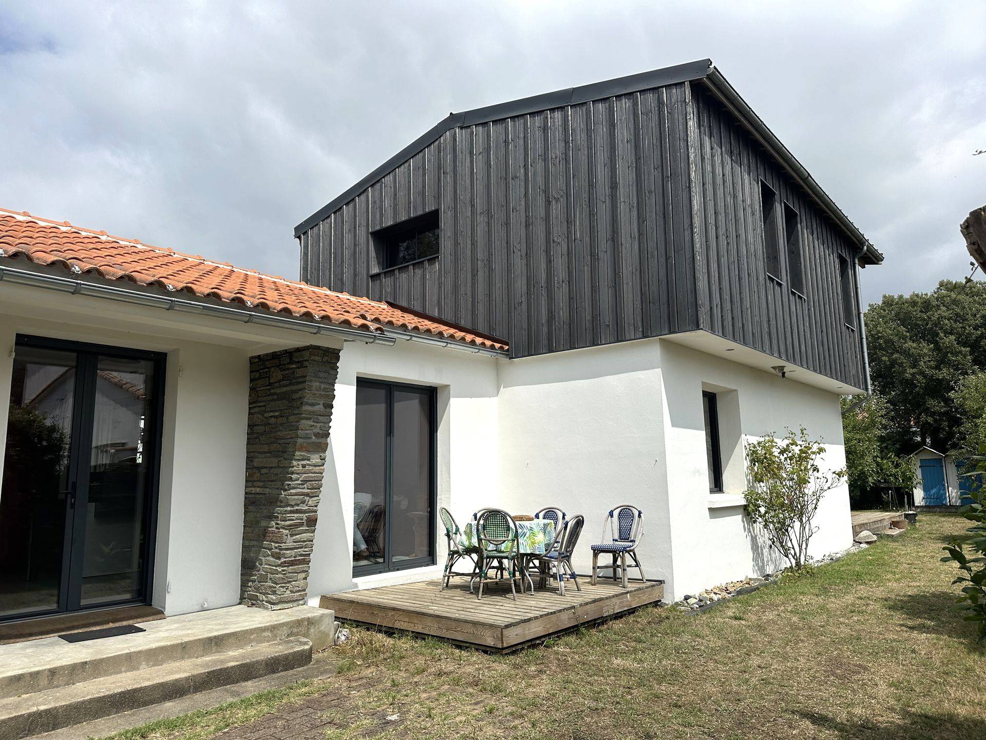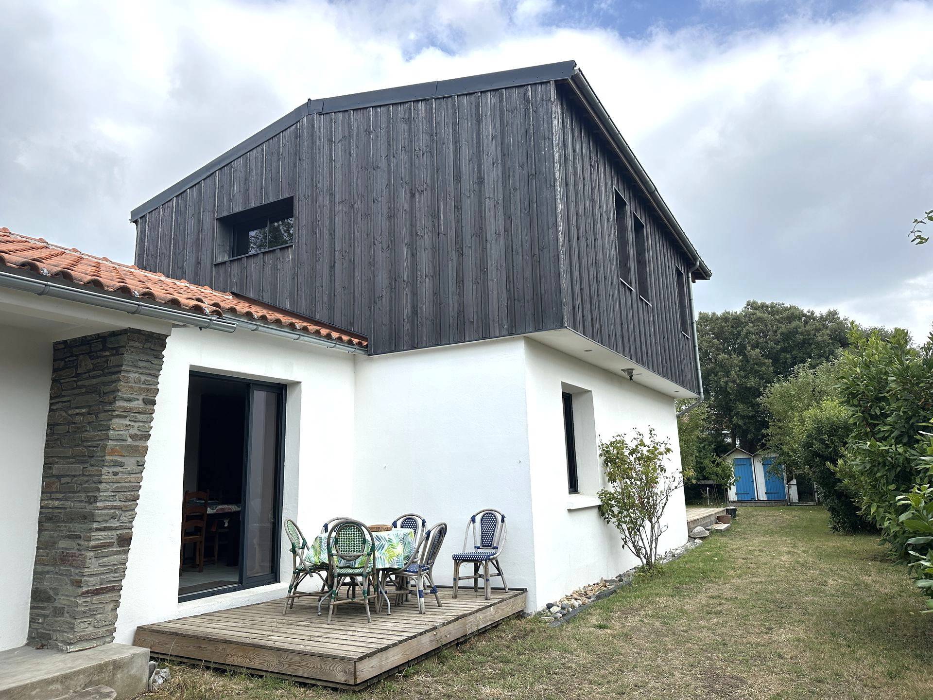 Nichée au calme, au bout d'un chemin privé, cette maison saura vous surprendre par ses volumes et son cadre verdoyant. Édifiée dans les années 60 puis surélevée en 2015, elle offre aujourd'hui une belle surface habitable de 139 m² répartie sur deux niveaux, le tout sur un terrain généreux de 1309 m². Au rez-de-chaussée, vous découvrirez une pièce de vie chaleureuse, prolongée par un salon baigné de lumière donnant directement sur la terrasse arrière et le jardin. La cuisine semi-ouverte s'intègre harmonieusement à la salle à manger, créant un espace convivial pour toute la famille. Une suite parentale, une lingerie et un WC séparé complètent ce niveau. À l'étage, un espace de 52 m² accueille sur le palier un espace détente et loisir, deux chambres avec mezzanine ainsi qu'une troisième chambre avec dressing, et une salle d'eau. Le jardin, à l'abri des regards, est un véritable havre de paix. Vous profiterez pleinement des beaux jours grâce aux arbres fruitiers (pommier, prunier, poirier) qui vous permettront de préparer confitures et tartes maison. Un cadre idéal pour partager des moments gourmands à l'ombre des arbres ou sur la terrasse avec vos proches. Au tout s'ajoute un grand préau ouvert qui permet de stationner voitures et de stocker le matériel de voile et surf. Une maison pleine de charme, idéale pour une vie paisible en famille ou un projet de résidence secondaire à deux pas du littoral vendéen. Les informations sur les risques auxquels ce bien est exposé sont disponibles sur le site Géorisques : www.georisques.gouv.fr